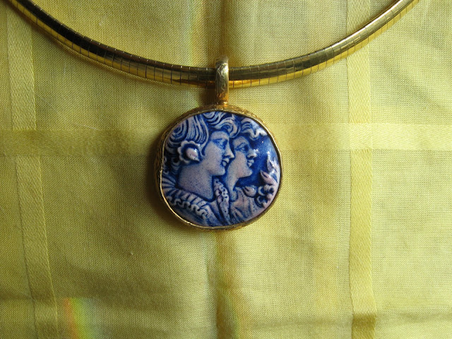 A ceramic cameo made in Israel. Like willow ware china this goes with everything. I like to keep the willow ware theme going and wear this with blue and white. But it looks great with red, yellow, turquoise and more. I've bought exactly two things from TJ Max and this is one of them. I don't like mall or outlet store jewelry but when I see something this special all rules are proved by their exceptions.